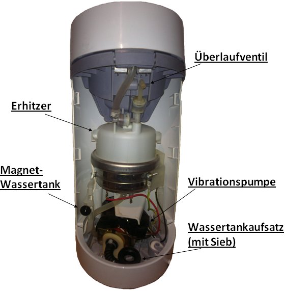 Der vermeidlich einfache Aufbau einerKaffeepadmaschine ist ihr größter Vorteil. Eine Vibratiospumpe, ein Erhitzer und Zuleitungen. Die Idee – je weniger drin, desto weniger kann kaputt gehen. Und es funktioniert! Folgender Ablauf des Brühvorganges: Beim Start wird der Erhitzer auf Temperatur gebracht. Ist dies passiert, wird aus dem Wassertank durch die Vibrationspumpe siebpassiertes Wasser zeitgesteuert (1 bzw. 2 Tassen) angesaugt und durch den Erhitzer gepresst. Beim Passieren wird das Wasser auf ca. 90°C erwärmt und in die Padkammer eingeleitet. Diese ist komplett mit Kaffeepulver (Kaffeepad) gefüllt, es kommt zum Überdruck durch das einströmende Wasser – Kaffeebrühung. Das enge Durchflussloch des Padträgers erzeugt den charakteristischen Schaum. Fertig ist der Kaffeepad-Kaffee.